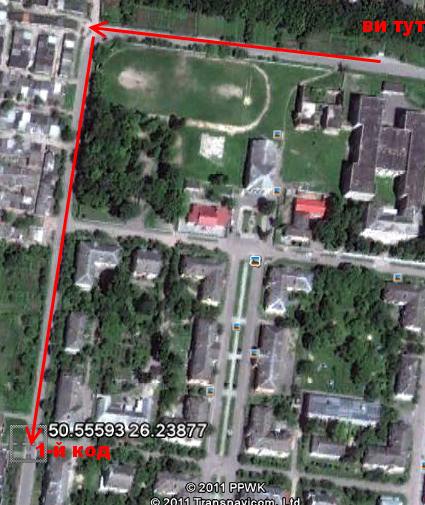 Макклейн ще сам не дуже усвідомлював,що його чекає далі. Бо те далі мало назву ралійка. 1 код знаходиться на знаку пішохідний перехід - 50.55593 26.23877 карта доїзду тут 2 код знаходиться на білборді - 50.54642 26.25731 карта доїзду тут 3 код - слідуємо знаку Зал.Вокзал (за мостом повертаємо наліво). На зупинці зправа знімаємо код. 50.53693 26.25845 карта доїзду тут Код доїзду знаходиться на об"єкті зліва - 50.52562 26.25857. карта доїзду тут Все нанесення чорним маркером. Об"єкт позначений міткою 90EN чорним балоном,з кодом доїзду під міткою.